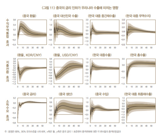 이에 따라 한은은 VAR 모형을 이용해 중국 통화정책 변화가 대중 수출 및 무역수지 등 우리나라 교역변수(무역경로)와 이자율, 주가, 물가 등 금융변수(금융경로)에 미치는 영향을 분석했다.