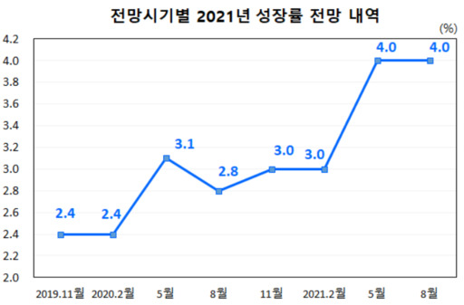 한은에 따르면 올해 실질 국내총생산(GDP)은 코로나19에도 불구하고 4.0% 성장률을 달성할 것이다. 글로벌 경기회복에 따라 수출과 투자 호조가 이어지면서다. 민간소비도 향후 백신접종 확대, 추경 집행 효과 등으로 점차 개선될 전망이다. 설비투자와 건설투자도 글로벌 경기회복과 양호한 착송실적 등에 힘입어 견조한 흐름을 이어갈 것으로 기대됐다. 여기에 상품수출도 주요국의 경기회복 등에 따라 양호한 흐름을 나타낼 것으로 관측된다.
