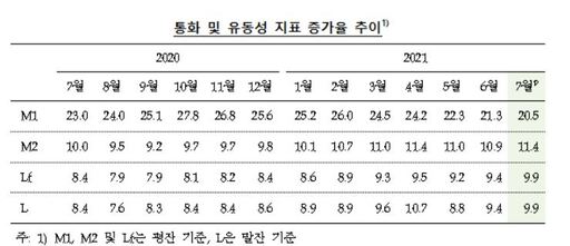 한국은행이 14일 발표한 '7월 중 통화 및 유동성 통계'에 따르면 광의통화량(M2 기준)은 3442조9000억원으로 전월 대비 32조1000억원(0.9%) 증가했다.