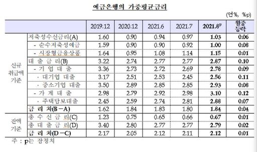 대출금리와 저축성수신금리 차는 1.84%p로 전월 대비 0.04%p 늘어났다.