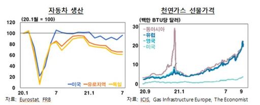 유로지역은 자동차 생산 비중이 미국보다도 큰데 반도체 공급차질 장기화로 독일을 중심으로 생산부진이 심화되고 있기 때문이다. 국제유가의 높은 수준 지속, 재고부족 및 수입차질로 인한 천연가스 가격 상승세와 중국 전력난이 동시에 맞물리면서 당분간 에너지가격도 높은 오름세를 보일 것으로 예상되고 있다.
