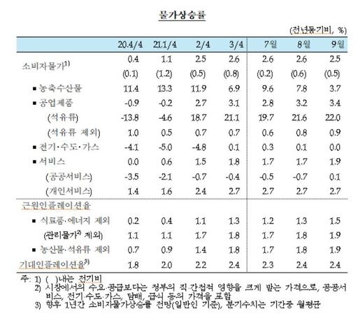 소비자물가 상승률도 9월 들어 전년 동기보다 2.5% 오르며 2%대 중반 수준을 지속하고 있다. 농축수산물가격 오름세가 둔화했으나 석유류가격이 높은 상승세를 이어가면서다. 특히 외식물가 및 가공식품가격 오름폭이 확대됐다. 근원인플레이션율(식료품 및 에너지 제외)도 1.5%로 전월(1.3%)보다 상승했다.
