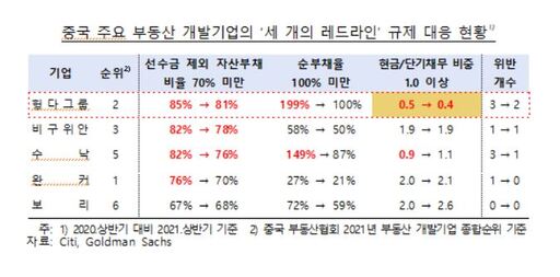 강도 높은 규제도 영향을 끼쳤다. 중국정부는 지난해부터 부동산개발기업에 대한 '세 개의 레드라인 규제(三條紅線)'를 도입해 부실 부동산기업의 신규차입을 제한하는 등 관리감독을 강화해 왔다. 헝다그룹은 그간의 부채 구조조정 노력에도 불구하고 주요 부동산 개발기업 대비 레드라인 위반 개수가 많은 것으로 나타났다.