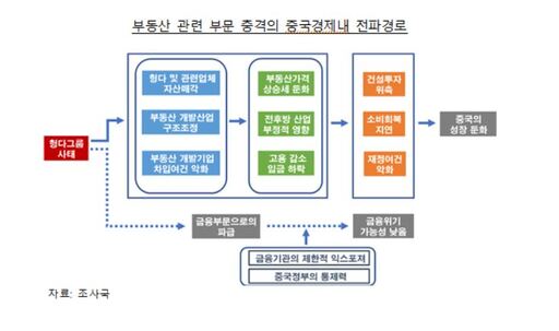 중국경제 내 부동산 관련 부문 비중이 높아 주택경기 둔화, 건설투자 부진으로 이어질 경우 성장에 부정적인 영향은 불가피할 것으로 보인다. 헝다그룹 및 관련업체의 보유자산 매각, 투자심리 위축 등이 소비심리에 영향을 미쳐 소비 회복세 지연을 초래할 수도 있다. 부동산 경기 부진으로 지방정부의 주요 재원인 토지사용권 판매수입이 줄어든다는 점에서 재정여건 악화 요인으로 작용할 수 있을 것이란 분석도 나온다.