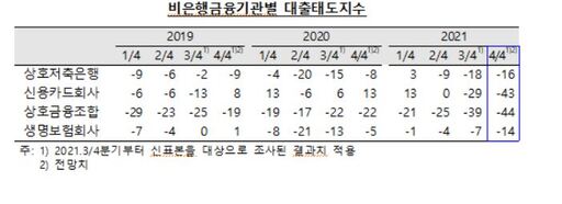 상호저축은행과 신용카드 등 비은행금융기관의 대출태도 역시 모든 업권에서 강화될 전망이다. 대출태도지수는 상호저축은행 -16, 신용카드사 -43, 상호금융조합 -44, 생명보험회사 -14 등이다.