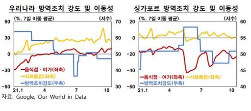위드코로나 정책에 따른 소비회복 효과는 음식점·여가시설 이동성이 식료품점보다 큰 폭으로 상승했다. 코로나19 대유행 시 대면접촉 시설을 중심으로 방역조치가 강화됐기 때문이다.