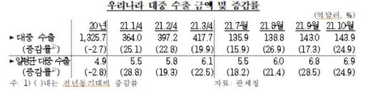 수출 규모(월)가 꾸준히 확대되며 올 7월부터는 신종 코로나바이러스 감염증(코로나19) 확산 이전 수출 호조기(2018년 평균, 135억1000만달러) 수준을 상회하기 시작했다. 영업일수 효과가 제거되는 일평균 기준으로는 7월 이후 증가세도 점차 확대되고 있다.