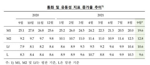 한국은행이 13일 발표한 '9월 중 통화 및 유동성 통계'에 따르면 광의통화량(M2 기준)은 3512조1000억원으로 전월 대비 17조3000억원(0.5%) 증가했다.