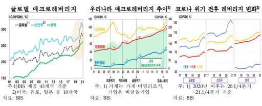 문제는 모든 경제부문의 레버리지가 높은 상황에서 빠르게 증가할 때 실물·금융경제의 하방 리스크 확대 등 부정적 영향이 심화될 가능성이 있다는 점이다. 민간 레버리지 수준이 높고 재정여력이 크지 않은 상황에서 민간부문이 디레버리징 될 경우 경기충격이 크고 회복에 장기간이 소요돼서다.