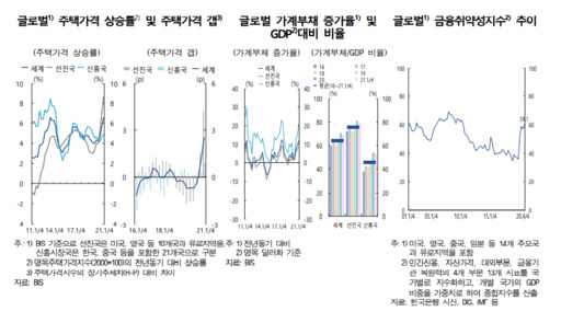 최근 글로벌 공급병목 현상 및 인플레이션 상승 압력 증대, 주요국 통화정책 변화, 중국 금융·경제 상황 악화 가능성 등과 같은 대외 리스크에 대한 우려도 높아졌다. 과거 글로벌 금융위기 사례에 비춰볼 때 대외 불안 요인이 급격하게 확대될 경우 경제주체의 투자심리가 빠르게 위축되고 자본유출입 및 자산가격의 변동성이 커질 수 있다는 분석이다.