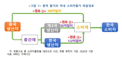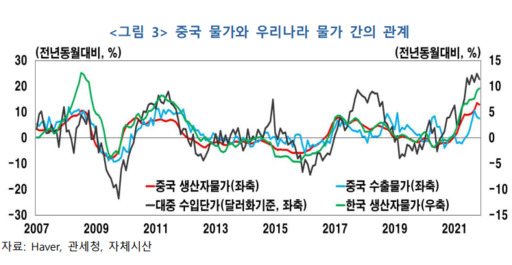 특히 중국 및 아세안5개국으로부터의 수입소재가 구입빈도가 높은 생필품을 다수 포함하고 있는 점을 고해야한다고 강조했다. 중국 물가의 높은 오름세 지속이 인플레이션 기대심리를 자극할 가능성에도 유의할 필요가 있다는 설명이다.