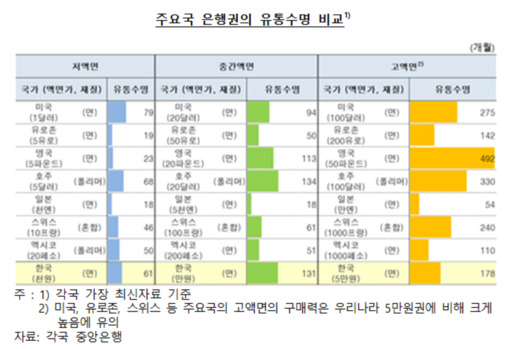 최고액면인 5만원권의 유통수명은 주요국 중 영국, 호주, 미국, 스위스에 이어 다섯 번째로 긴 수준이다. 우리나라 5만원권의 경우 주요국 최고액면 대비 구매력이 낮아 실제 거래에도 상대적으로 널리 사용됨에 따라 이들 주요국 최고액면에 비해 유통수명이 다소 짧았다.