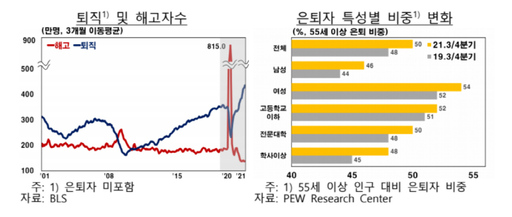 하지만 향후 감염병 상황이 진정(육아부담 축소, 이민노동자 증대)되고 누증된 저축이 소진되면서 점차 정상화될 것으로 예상된다. 다만 조기은퇴로 인한 경제활동인구의 일부 영구적 손실은 불가피할 것이란 설명이다.