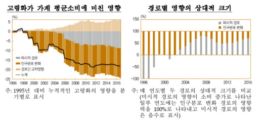6일 한국은행이 최근 내놓은 '인구 고령화에 따른 경제주체들의 생애주기 소비변화 분석' 보고서에 따르면 지난 1995년부터 2016년까지 약 20여 년간 인구 고령화는 가계소비를 연평균 약 0.9%(누적기준 18%) 정도 하락시킨 것으로 분석됐다. 기대수명 증가에 따른 가계 소비선택의 변화(미시적 경로)와 인구분포의 변화(인구분포 변화 경로)는 모두 가계소비 감소의 주요 요인으로 작용했다.