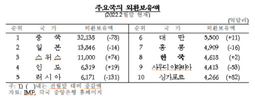 외환보유액은 유가증권이 4102억1000만달러로 89.6%를 차지했고 ▲예치금 228억1000만달러(5.0%) ▲SDR 154억2000만달러(3.4%) ▲금 47억9000만달러(1.0%) ▲IMF포지션 45억8000만달러(1.0%) 등이다. 지난 2월 말 기준 우리나라의 외환보유액 규모는 세계 8위 수준이다.