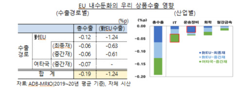 이를 종합적으로 고려하면 EU경기 회복세 둔화로 인한 우리 수출의 부정적 효과가 수출 기업경쟁력 약화 등으로 이어지지 않도록 노력해야 한다는 설명이다.