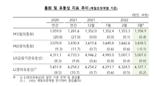 한국은행이 12일 발표한 '2022년 3월 중 통화 및 유동성' 통계에 따르면 광의통화량(M2 기준)은 3658조5000억원으로 전월 대비 4조1000억원(0.1%) 줄었다.