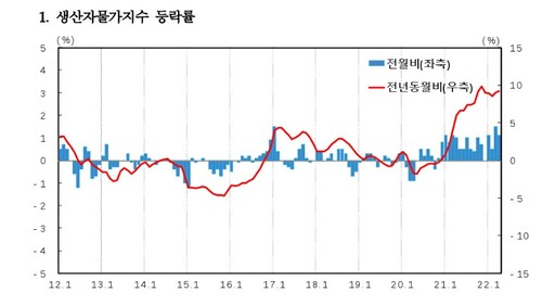 최근 한국은행이 발표한 4월 생산자물가지수는 118.02(2015년 100기준)로 전월 대비 1.1% 올라 4개월 연속 상승했다. 상승폭은 전월(1.5%)보다 소폭 줄었지만, 지수 자체로는 역대 최고치다. 전년 동월 대비로는 9.2% 상승해 17개월 연속 상승세를 지속했다.