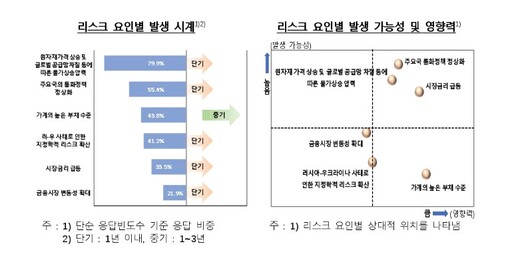 1순위 응답빈도수 기준으로는 '원자재 가격 상승 및 글로벌 공급망 차질 등에 따른 물가상승 압력'(34.2%), '주요국의 통화정책 정상화'(15.2%), '가계의 높은 부채 수준'(11.4%), '시장금리 급등'(10.1%) 등으로 나타났다. 주요 리스크 요인 중 '원자재 가격 상승 및 글로벌 공급망 차질 등에 따른 물가상승 압력', '주요국의 통화정책 정상화', '러시아-우크라이나 사태로 인한 지정학적 리스크 확산', '시장금리 급등', '금융시장 변동성 확대'는 대체로 단기(1년 이내)에 '가계의 높은 부채 수준'은 중기(1~3년)에 위험이 현재화될 가능성이 있는 것으로 응답했다.