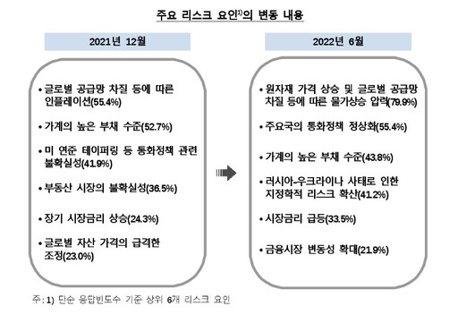 30일 한국은행이 발표한 '상반기 시스템 리스크 서베이 결과'에 따르면 금융시스템의 주요 리스크 요인으로 '원자재 가격 상승 및 글로벌 공급망 차질 등에 따른 물가상승 압력'이라는 답변이 79.9%(단순 응답빈도수 기준)로 가장 많았다. '주요국의 통화정책 정상화'(55.4%)와 '가계의 높은 부채 수준'(43.8%), '러시아-우크라이나 사태로 인한 지정학적 리스크 확산'(41.2%) 등이 그 뒤를 이었으며, '시장금리 급등'(33.5%)과 '금융시장 변동성 확대'(21.9%) 등도 높은 순위를 차지했다.