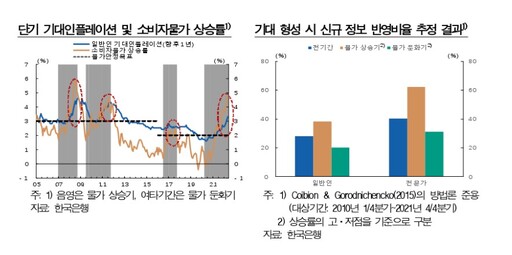한은은 "물가 상승기에 언론 기사 등을 통해 물가와 관련한 정보가 더 많이 제공되고 실질소득 감소로 경제주체의 물가정보에 대한 민감도가 더 커지기 때문"이라고 설명했다.