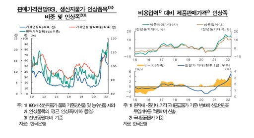 기업 가격설정 경로의 경우 최근 판매가격 기업경기실사지수(BSI)가 큰 폭 상승한 가운데 생산자물가의 인상품목 비중도 크게 확대되고 인상 폭도 예년에 비해 높은 수준을 기록했다. 기업들의 판매가격 인상폭은 원자재가격 등 높아진 비용압력을 감안하더라도 과거보다 높은 수준인 만큼 향후 물가상승 기대를 일부 반영하고 있다는 평가다. 높은 기대인플레이션 수준, 원재료 가격 오름세 지속 등을 고려할 때 당분간 기업의 가격인상 유인이 상존하면서 물가상승 압력을 높이는 요인으로 작용할 것으로 판단된다.