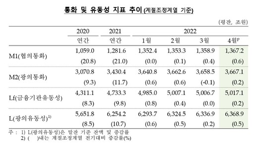 한국은행이 15일 발표한 '2022년 4월 중 통화 및 유동성' 통계에 따르면 광의통화량(M2 기준)은 3667조1000억원으로 전월 대비 8조5000억원(0.2%) 증가했다. 전년 동월 대비로는 9.4% 늘며 전월(10.8%)보다는 하락했다.