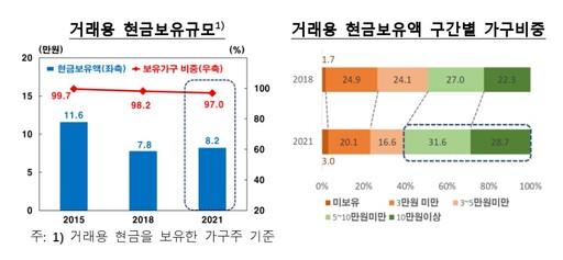 가계의 거래용 현금보유는 큰 변화가 없었으나 예비용 현금은 보유 가구 비중이 크게 확대됐다. 2021년 조사대상 가구주의 대부분(97.0%)이 거래용 현금을 보유한 것으로 나타났다. 평균 현금보유액은 8만2000원으로 2018년(7만8000원)과 비슷한 수준을 기록했다. 현금보유액별로 보면 거래용 현금으로 5만원 이상을 보유한 응답자의 비중이 2018년(49.3%) 대비 11.0%포인트 상승하며 과반(60.3%)을 기록했다.