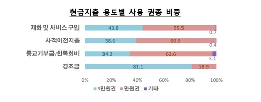 한편 현금지출 용도별로 주요 사용권종을 보면 재화 및 서비스 구입, 사적이전지출, 종교기부금·친목회비의 경우 만원권을, 경조금은 5만원권을 주로 사용하는 것으로 조사됐다.