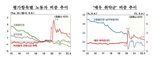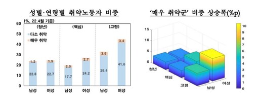 성별·연령별로는 남성 대비 여성의 취약노동자 비중이 더 높았다. 고령층의 경우 팬데믹 직후 고용의 질이 크게 악화됐다. 핵심노동연령층에서 남성보다 여성의 취약노동자 비중이 높은 현상은 경력단절 후 재취업 등의 영향으로 40대 이상 여성의 고용의 질이 저조한 데 주로 기인했다.