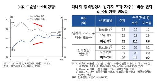 문제는 차입가계의 소비 및 부실위험에도 변화를 미치게 된다는 점이다. 부채증가는 소비를 늘리는데 기여하나 소득과 괴리되어 과도하게 늘면 채무상환부담이 가중되면서 소비를 제약하게 된다. 차주의 DSR이 상승할 경우 소비 임계수준을 상회하는 고DSR 차주가 늘어나면서다. 이 경우 이들 차주의 채무상환부담이 증가하며 소비성향 하락으로 이어질 수 있다는 설명이다.