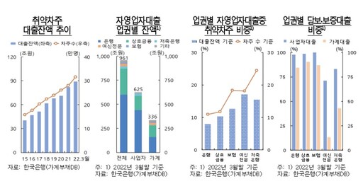 자영업자대출은 2022년 3월 말 960조7000억원으로 신종 코로나바이러스 감염증(코로나19) 직전(2019년 말) 대비 40.3% 증가했다. 정부의 금융지원조치는 자영업 가구의 채무상환부담을 낮추는 효과가 있었던 것이라는 판단이다.
