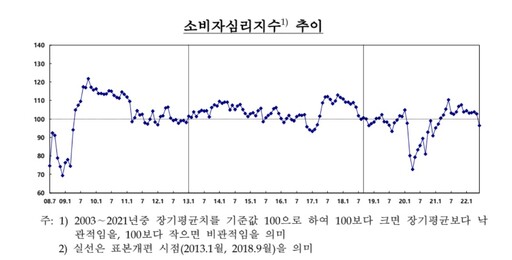CCSI는 소비자동향지수(CSI) 중 6개 주요지수(현재생활형편·생활형편전망·가계수입전망·소비지출전망·현재경기판단·향후경기전망)를 이용해 산출한 심리지표다. 기준값 100보다 크면 낙관적임을, 100보다 작으면 비관적임을 말한다