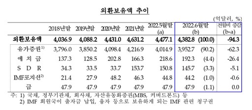 외환보유액은 유가증권이 3952억7000만달러로 90.2%를 차지했고 ▲예치금 192억3000만달러(4.4%) ▲SDR 145억7000만달러(3.3%) ▲금 47억9000만달러(1.1%) ▲IMF포지션 44억2000만달러(1.0%) 등이다. 지난 5월 말 기준 우리나라의 외환보유액 규모는 세계 9위 수준이다.
