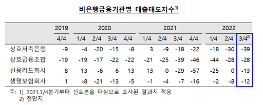상호저축은행과 신용카드 등 비은행금융기관의 대출태도는 모든 업권에서 여전히 강화 기조를 이어갈 것으로 관측된다. 대출태도지수는 상호저축은행 -39, 상호금융조합 -28, 신용카드회사 -13, 생명보험회사 -12 등이다.