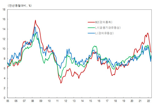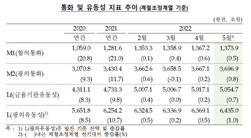 한국은행이 12일 발표한 '2022년 5월 중 통화 및 유동성' 통계에 따르면 광의통화량(M2 기준)은 3696조9000억원으로 전월 대비 29조8000억원(0.8%) 증가했다. 전년 동월 대비로는 9.3% 늘며 전월(9.4%)보다는 둔화됐다.