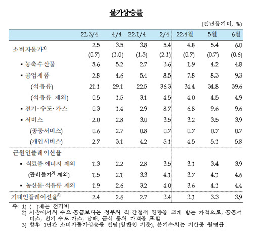 통계청에 따르면 6월 소비자물가지수는 108.22(2020=100)로 1년 전보다 6.0% 올랐다. 전월 5.4%보다는 0.6%p 확대됐다. 전년 동월과 비교하는 소비자물가는 지난해 10월(3.2%), 11월(3.8%), 12월(3.7%), 올해 1월(3.6%), 2월(3.7%)까지 5개월 연속 3%를 기록했다. 3월(4.1%)과 4월(4.8%) 4%대에 이어 5월 5.4%까지 오르더니 지난달에는 6.0%까지 치솟은 것이다.