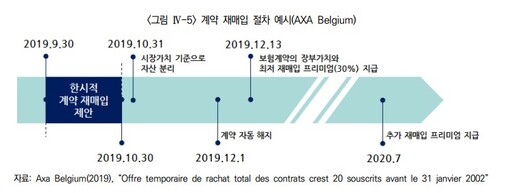 보험연구원이 내놓은 '보험산업 수익성과 대응방안 : 내재가치를 중심으로' 보고서를 살펴보면 벨기에 생보사들은 재무건전성 강화를 위해 고금리 보증계약에 대한 계약재매입을 실시했다. 회사가 재매입 프리미엄을 제시한 후 일정 기간(1~3개월) 동안 보험계약자의 신청을 받는 형식을 활용해서다.
