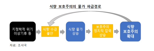 식량산업은 기후 및 지역에 대한 의존도가 높고 무역거래의 비중이 낮다. 또 일부 국가 및 곡물 메이저들의 과점구조가 고착되어 있어 공급충격에 구조적으로 취약하다는 설명이다. 국가 간 공조체제가 작동했던 과거와 달리 최근 글로벌 경제의 지경학적 분열(geo-economic fragmentation) 움직임은 식량자원 수단화를 가속화해 에너지 가격 상승 및 이상기후 증가 추세와 함께 향후 식량가격 불안 요인으로 작용하고 있다는 평가다.