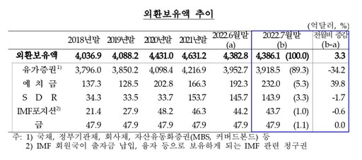 외환보유액은 유가증권이 3918억5000만달러로 89.3%를 차지했고 ▲예치금 230억달러(5.3%) ▲SDR 143억9000만달러(3.3%) ▲금 47억9000만달러(1.1%) ▲IMF포지션 43억7000만달러(1.0%) 등이다. 지난 6월 말 기준 우리나라의 외환보유액 규모는 세계 9위 수준이다.