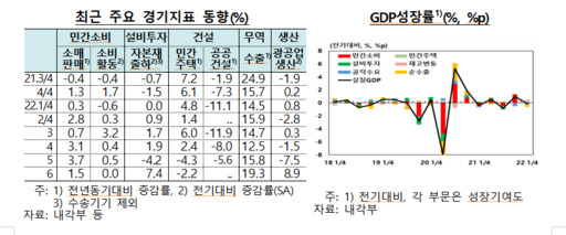 수출(통관, 전년 동기 대비)은 중국 봉쇄 등 공급제약 영향으로 자동차 부문이 부진했으나 일반기계 등을 중심으로 증가세가 지속됐다. 설비투자(수송기기 제외 자본재출하지수, 전기 대비)는 중국 봉쇄 조치 영향으로 지난 5월에 부진했다 6월 들어 큰 폭 증가로 돌아섰다. 건설투자의 경우 민간주택건설(착공건수, 전년 동기 대비) 증가세가 소폭 둔화됐으며 공공건설(기성액, 전년동기대비)은 감소세를 이어갔다.