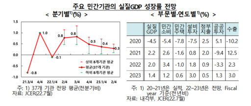 주요 민간기관은 올해 분기별 실질국내총생산(GDP) 성장률(전기 대비, SA) 경로를 2분기 0.8%→3분기 0.8%→4분기 0.5%로 예측했다. 4분기에는 세계 경제 성장세가 둔화되면서 성장률이 하락할 전망이다.