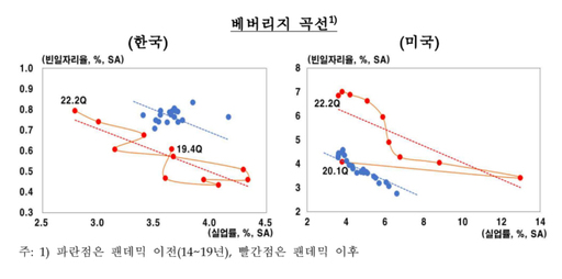 5일 한국은행이 내놓은 BOK이슈노트 '베버리지 곡선을 통한 노동시장 평가: 미국과의 비교를 중심으로'에 따르면 최근 미국에서는 우상향한 베버리지 곡선을 중심으로 미 연준(경기 연착륙론)과 일부 학자들(경기 경착륙론) 사이에서 경기 관련 논쟁이 활발히 진행되고 있다.