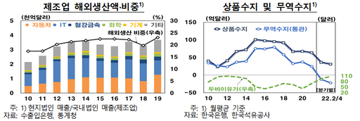 윤용준 한은 조사국 국제무역팀 차장은 "글로벌 교역여건상 주력 산업의 해외생산 확대가 불가피하더라도 투자여건 개선 및 혁신생태계 조성을 통해 국내 기반 제조업의 수출경쟁력을 강화해 나갈 필요가 있다"라고 말했다.