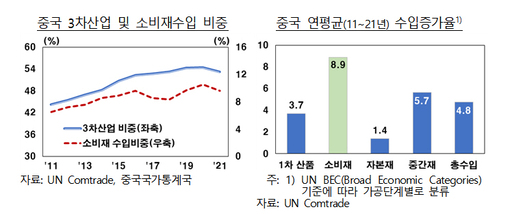 먼저 실증분석 결과와 같이 탄소중립 정책추진으로 중국경제의 서비스화가 촉진되면서 중국의 상품 수입구조 변화도 가속화될 전망이다. 실제 중국경제가 3차산업 비중 확대에 따라 내수 중심의 성장구조로 전환하면서 전체 수입 가운데 소비재 비중도 점차 증가하고 있다. 지난 10년간(2011~2021년) 중국의 소비재 수입 증가율은 연평균 8.9%를 기록하여 중간재(5.7%) 수입 증가율을 상회하고 있다.
