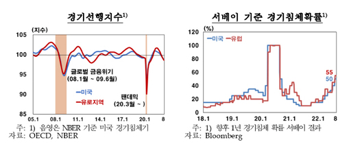 한은이 다양한 지표와 계량분석방법을 이용하여 추정해본 결과 최근 들어 미국·유럽 모두 경기침체 가능성이 높아졌다. 미국보다 유럽의 침체가능성이 상대적으로 더 높은 것으로 분석됐다.
