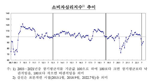 CCSI는 소비자동향지수(CSI) 중 6개 주요지수(현재생활형편·생활형편전망·가계수입전망·소비지출전망·현재경기판단·향후경기전망)를 이용해 산출한 심리지표다. 기준값 100보다 크면 낙관적임을, 100보다 작으면 비관적임을 말한다