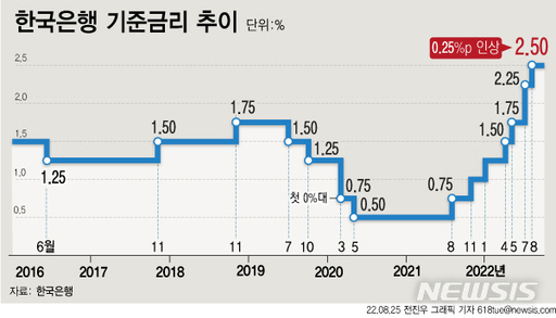 지난 8월 25일 금통위에서는 연 2.25%에서 2.50%로 0.25%p 인상하며 네 차례 연속 인상에 나섰다.