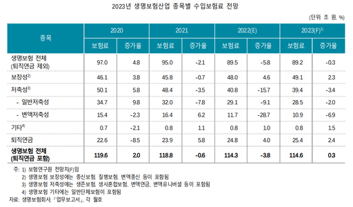 보험연구원은 내년 생보산업에서 일반저축성보험 및 변액저축성보험 수입보험료는 각각 2.0%, 6.9% 감소할 것으로 예상했다.