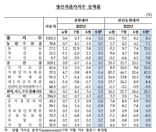 21일 한국은행에 따르면 9월 생산자물가지수는 120.16(2015년 100 기준)으로 전월과 비교해 0.2% 상승했다. 전년 동월 대비로는 8.0% 오르며 22개월 연속 오름세다.